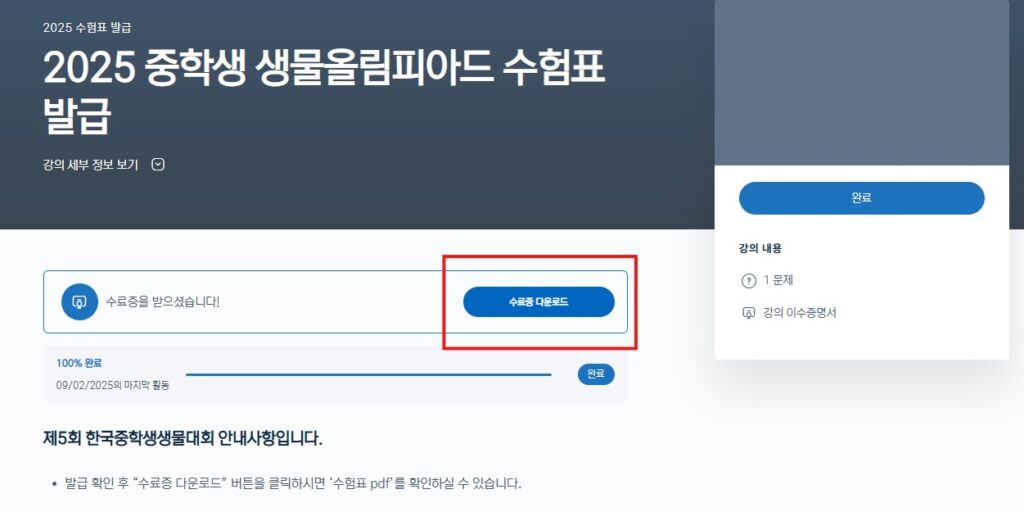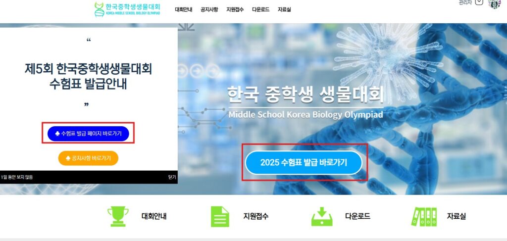 2025년도 제5회 한국중학생생물대회 수험표 출력 및 고사장 오시는 길 안내