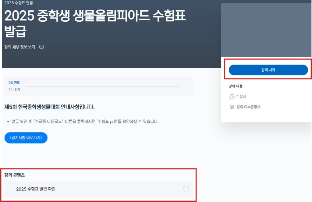 ③ 우측 [강의시작] 클릭 / 또는 하단의 [2025 수험표 발급확인] 클릭